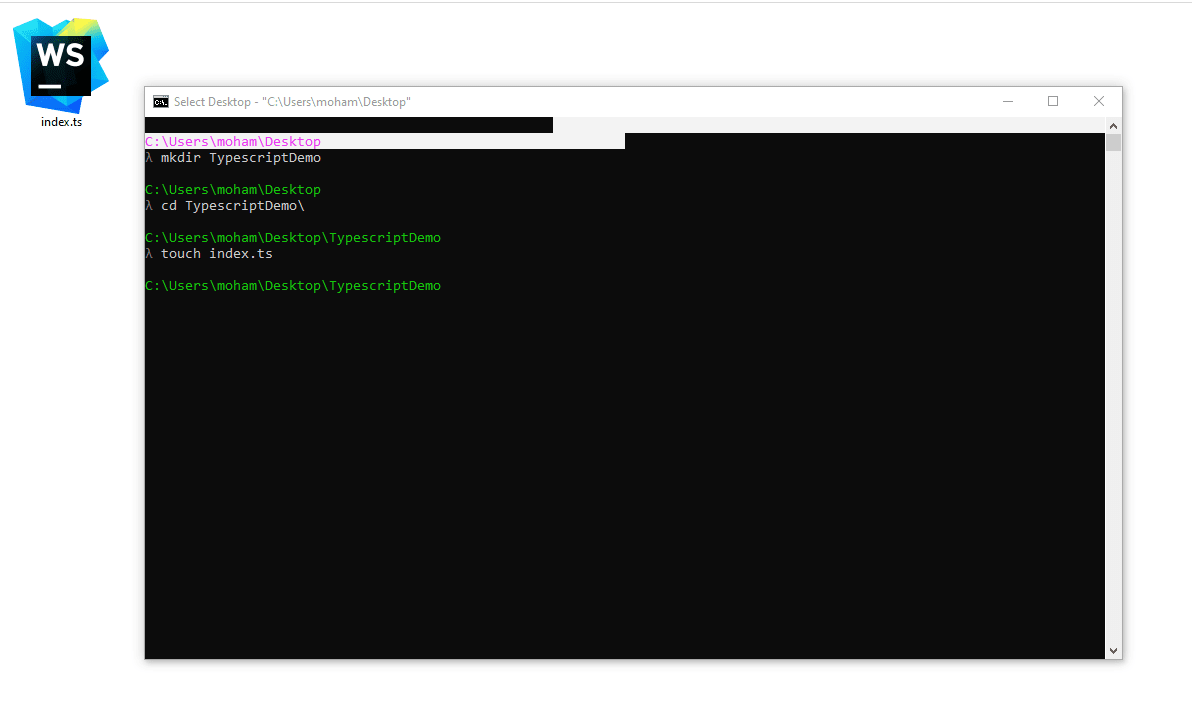 এই রকম একটা আউটপুট দেখা যাবে,এখন আমাদের সকল প্রকার প্রয়োজনীয় টুলস ইন্সটল করা শেষ । এখন আমরা কাজ শুরু করার জন্য প্রায় ৩০% রেডি,এতো কিছুর পর ও মাত্র ৩০%,হ্যা এখনো আমাদের অনেক কাজ বাকি। আসুন দেখে নেই সেগুলো কি? আমরা এখন আমাদের কাজ করার জন্য একটি প্রজেক্ট ফোল্ডার ক্রিয়েট করবো এখন আমরা সেই ফোল্ডার এর মধ্যে একটি index.ts ফাইল ক্রিয়েট করে নিবো।
