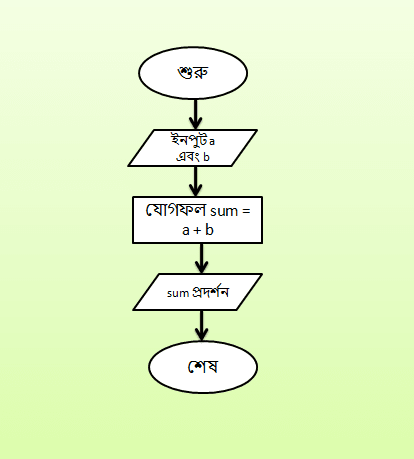 এখন যদি আমরা দুটি সংখ্যার যোগফল বের করার ফ্লোচার্ট (Flowchart) অঙ্কন করি তাহলে সেটি হবে এমন -