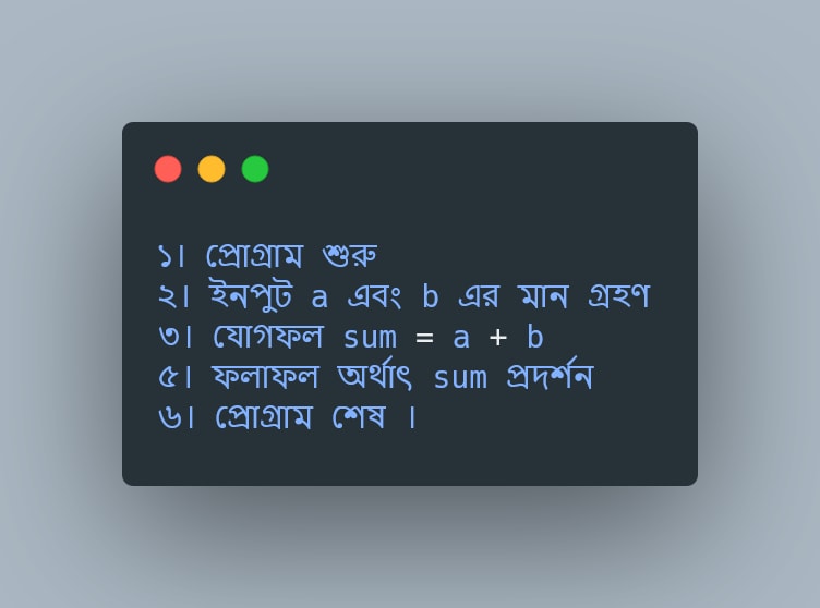 আমরা কিন্তু অবশ্যই দুটি সংখ্যার যোগফল বের করার অ্যালগরিদম লিখতে পারবো । যদি নাহ পারেন তাহলে আপনি গত পর্বগুলো ভালো ভাবে দেখেন নি বা পড়েন নি । তবুও আমি এই সহজ সমস্যার অ্যালগরিদম লিখতেছি -