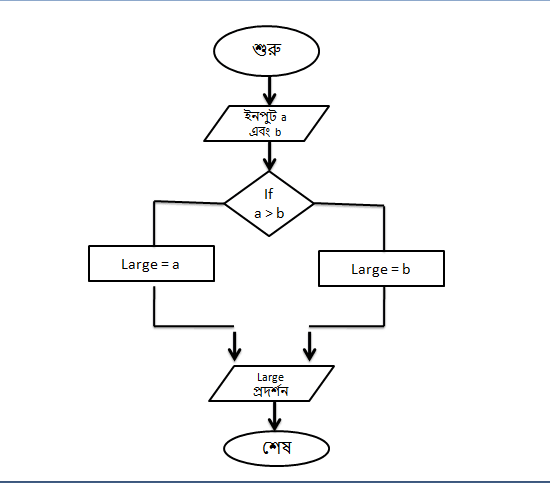সমস্যা ০২ - দুইটি সংখ্যার মধ্যে বড় সংখ্যা বের করার অ্যালগরিদম এবং ফ্লোচার্ট (Flowchart) দেখাও :-